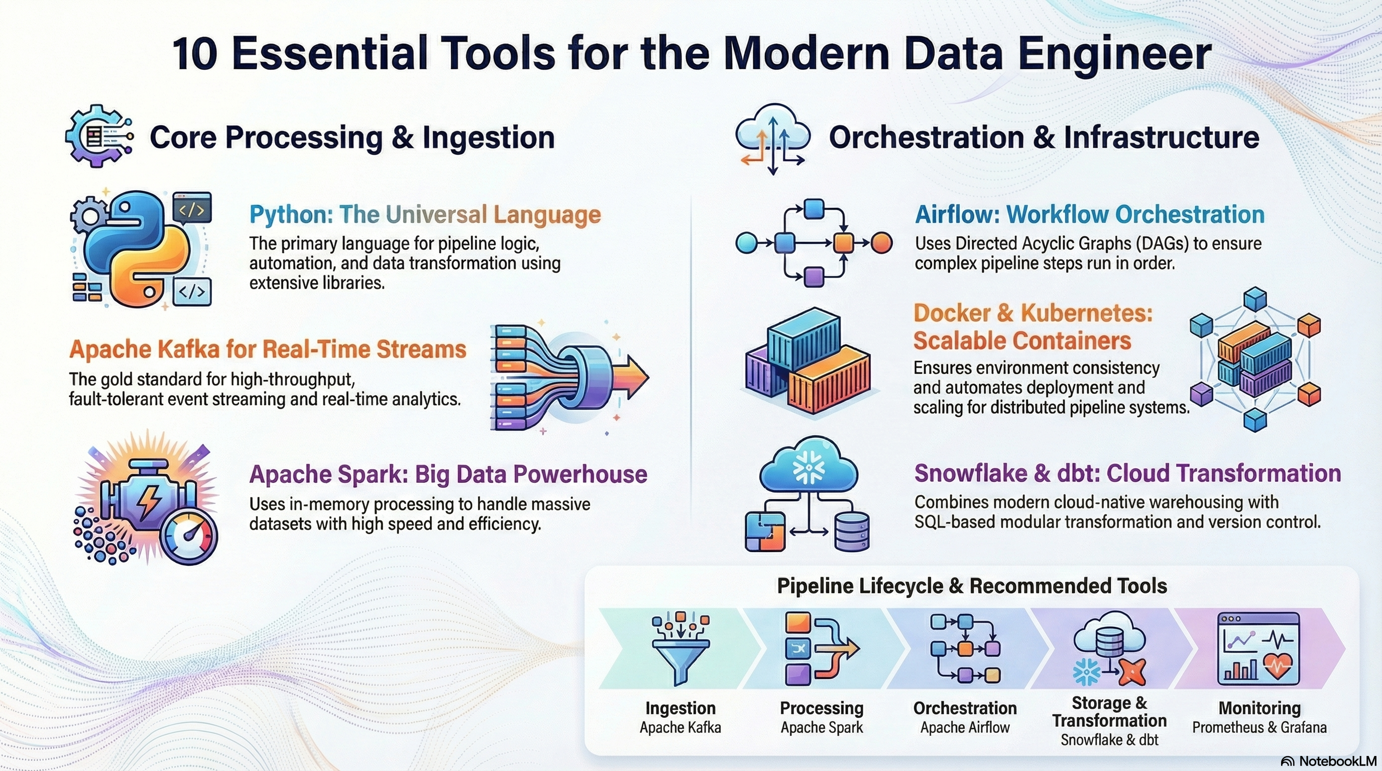 This guide walks you through 10 essential tools every data engineer should know to design, build, and maintain scalable data pipelines. These tools cover everything from ingestion and orchestration to monitoring and storage.
