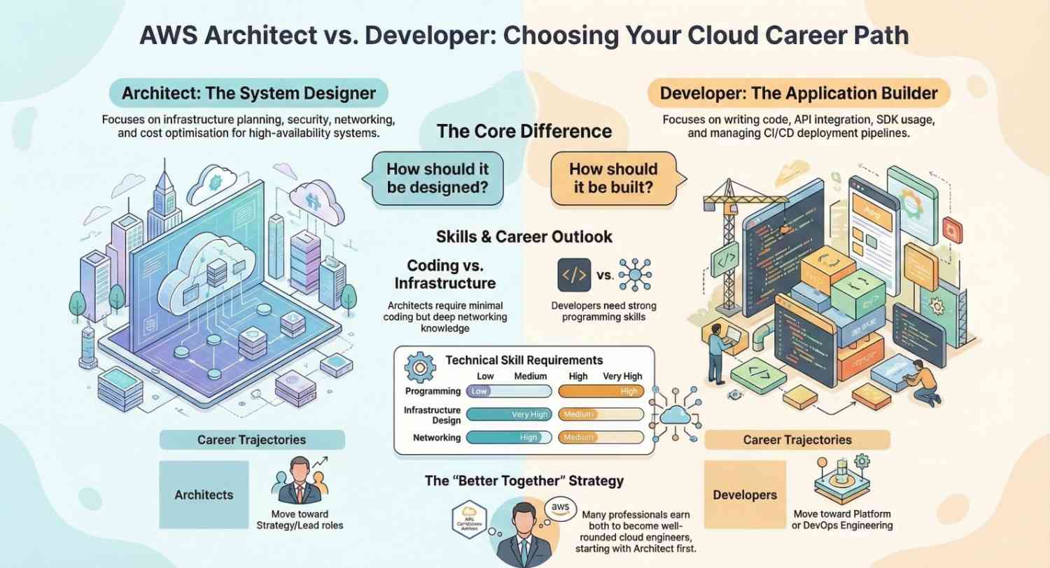 The comparison between AWS architect vs AWS developer certifications ultimately comes down to how you want to work in the cloud.