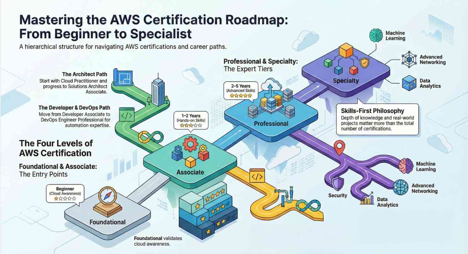 This in-depth guide explains AWS certification levels from Foundational to Specialty, answers common questions like how many AWS certifications are there and are AWS certifications worth it, and helps you choose the right path based on your career goals.