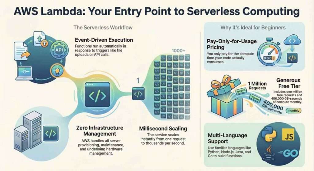 One of the biggest advantages of AWS Lambda is simplicity. Beginners don’t need deep knowledge of servers or infrastructure. Lambda is also cost-effective because you only pay for the time your code runs. There is even a free tier that allows new users to experiment without spending money.