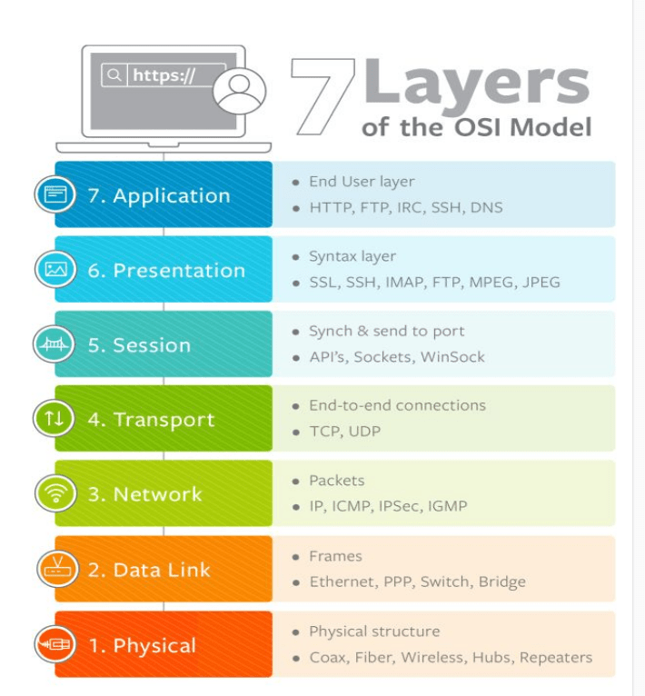 1. Physical Layer – Deals with physical transmission (e.g., cables, radio waves).