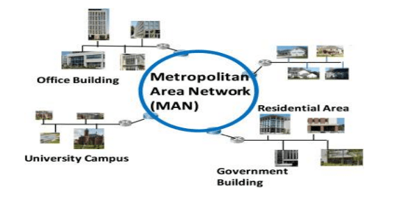 In educational environments, MANs connect multiple campuses of a university or different schools within a district, enabling shared access to learning resources, virtual classrooms, and centralized administrative services. One of the significant advantages of MANs is their ability to provide high bandwidth and low latency over relatively long distances, ensuring smooth data flow even when handling heavy traffic. Security in MANs is essential because they support critical city-level communication, so advanced encryption, firewalls, and monitoring systems are used to protect against cyber threats and unauthorized access. MANs can also act as the backbone for internet distribution within a city, connecting users to national or global networks through high-speed gateways. With the growth of smart cities, MANs have become even more important, enabling technologies such as smart traffic control, public safety systems, environmental monitoring sensors, and digital public services.