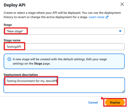 - In the Stage name, enter testingAPI (or any name you prefer).