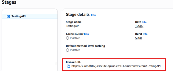 Once the API has been deployed, go to the Stages section — you’ll see your API stage listed (for example, testingAPI).