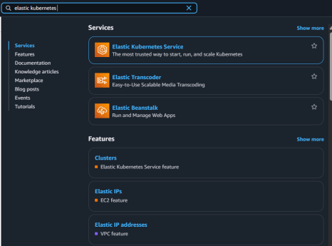 2. Open the EKS (Elastic Kubernetes Service) page by choosing it from the Services list under the Containers category.