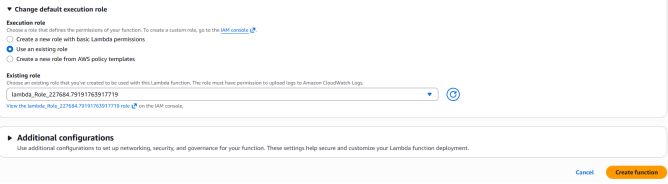 - Click on the change default execution role. Under this , Select Use an executive role and select lambda_Role_<Random_Number>.