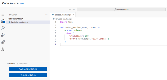 - Access the editor by double-clicking the lambda_function.py file located on the left panel.
