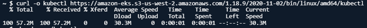 curl -o kubectl https://amazon-eks.s3-us-west-2.amazonaws.com/1.18.9/2020-11-02/bin/linux/amd64/kubectl
