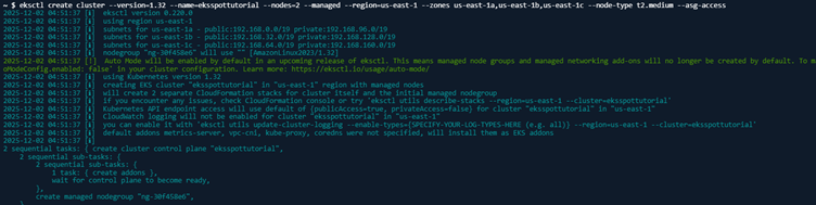 eksctl create cluster --version=1.32 --name=eksspottutorial --nodes=2 --managed --region=us-east-1 --zones us-east-1a,us-east-1b,us-east-1c --node-type t2.medium --asg-access