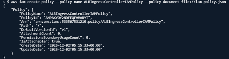aws iam create-policy --policy-name ALBIngressControllerIAMPolicy --policy-document file://iam-policy.json