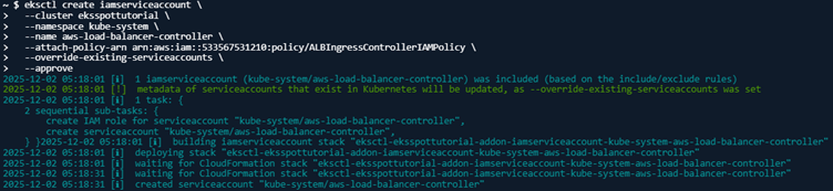 9. Create the service account associated with the IAM policy. Replace your AWS account id with the value obtained in the previous step:
