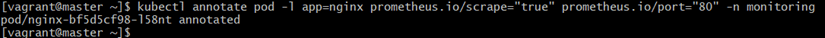kubectl annotate pod -l app=nginx prometheus.io/scrape="true" prometheus.io/port="80" -n monitoring