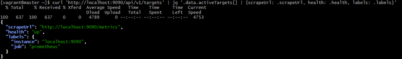 curl 'http://localhost:9090/api/v1/targets' | jq '.data.activeTargets[] | {scrapeUrl: .scrapeUrl, health: .health, labels: .labels}'
