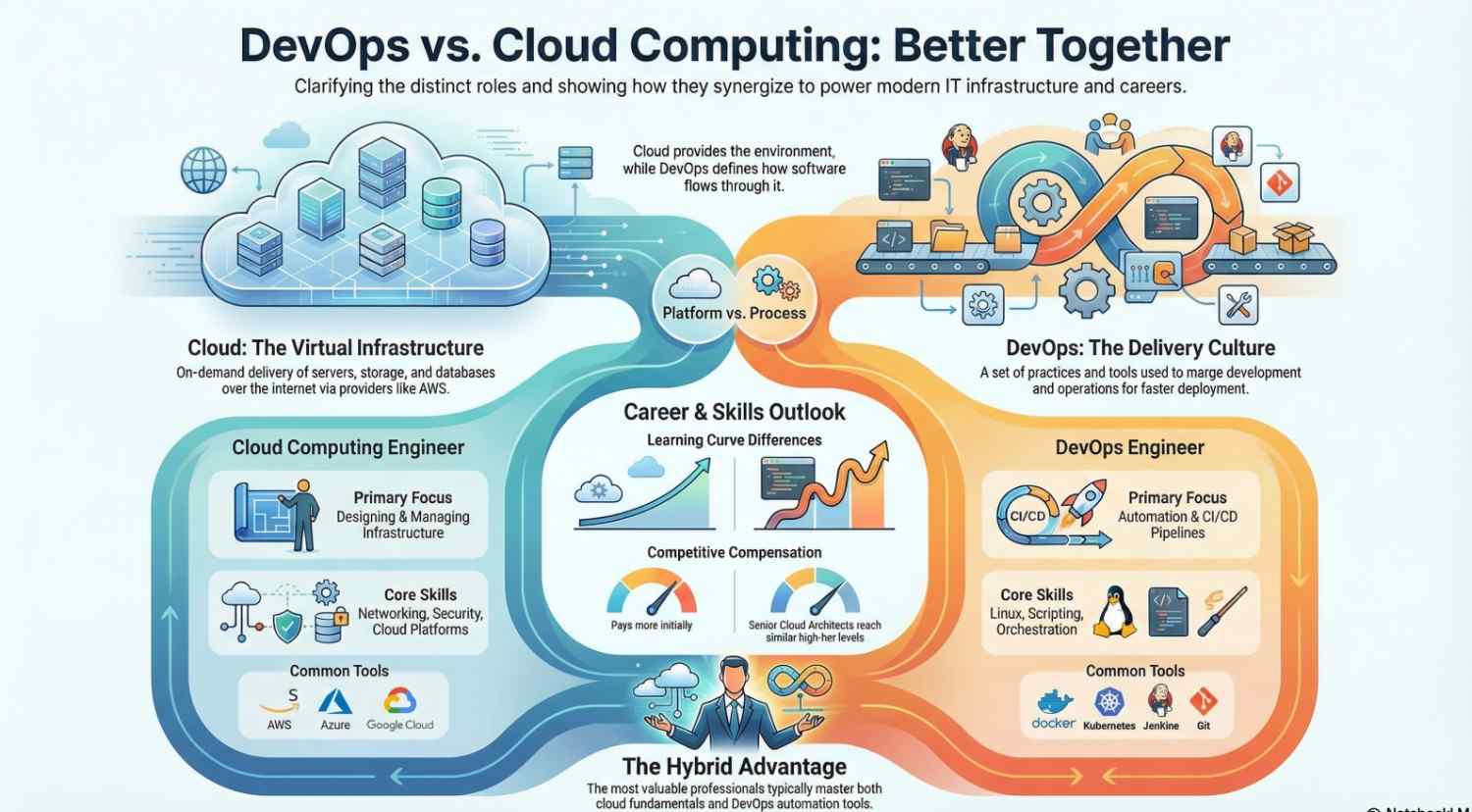 This Cloud Computing vs DevOps engineer comparison shows that cloud engineers build and manage the environment, while DevOps engineers optimize how software flows through it.