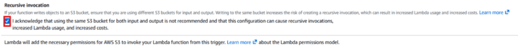 Enable Recursive invocation by checking the acknowledgment box. This helps prevent errors when multiple files are uploaded at the same time