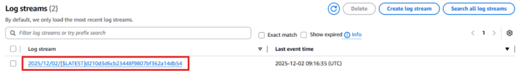 3. Open the log group for your Lambda function. It will appear in the format /aws/lambda/function-name.