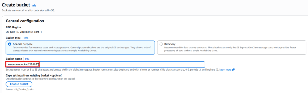 In this task, we will create two S3 buckets — a source bucket and a destination bucket — by specifying basic settings such as the bucket name and region.