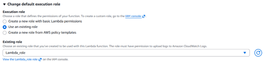 iv) Under the Permissions section, expand the settings by clicking Change default execution role, then choose Use an existing role.