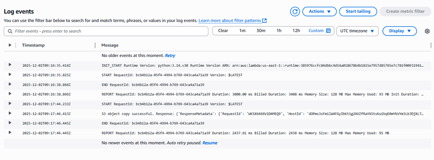 If you encounter errors such as the source file not being copied to the destination S3 bucket, please debug your Lambda function by following the steps mentioned below: