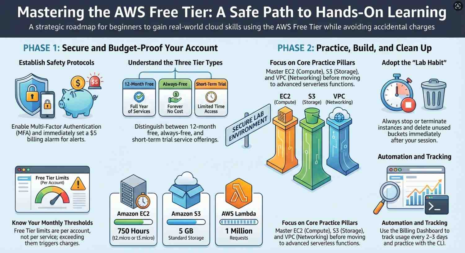 Unlike theoretical learning, AWS requires hands-on exposure. The Free Tier allows you to: