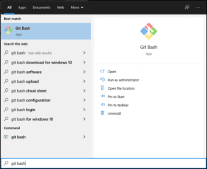 Follow the remaining steps and complete the installation. Once installed, you can find the Git Bash in the start menu by searching with “git bash” as shown below.