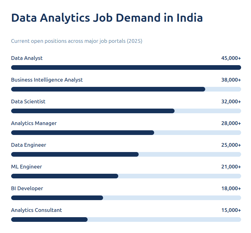 Every sector, from finance and healthcare to IT and e-commerce, relies on data analytics for growth and innovation. Global companies like Amazon, Google, Deloitte, and TCS continue to invest in data-driven decision-making and transformation.
