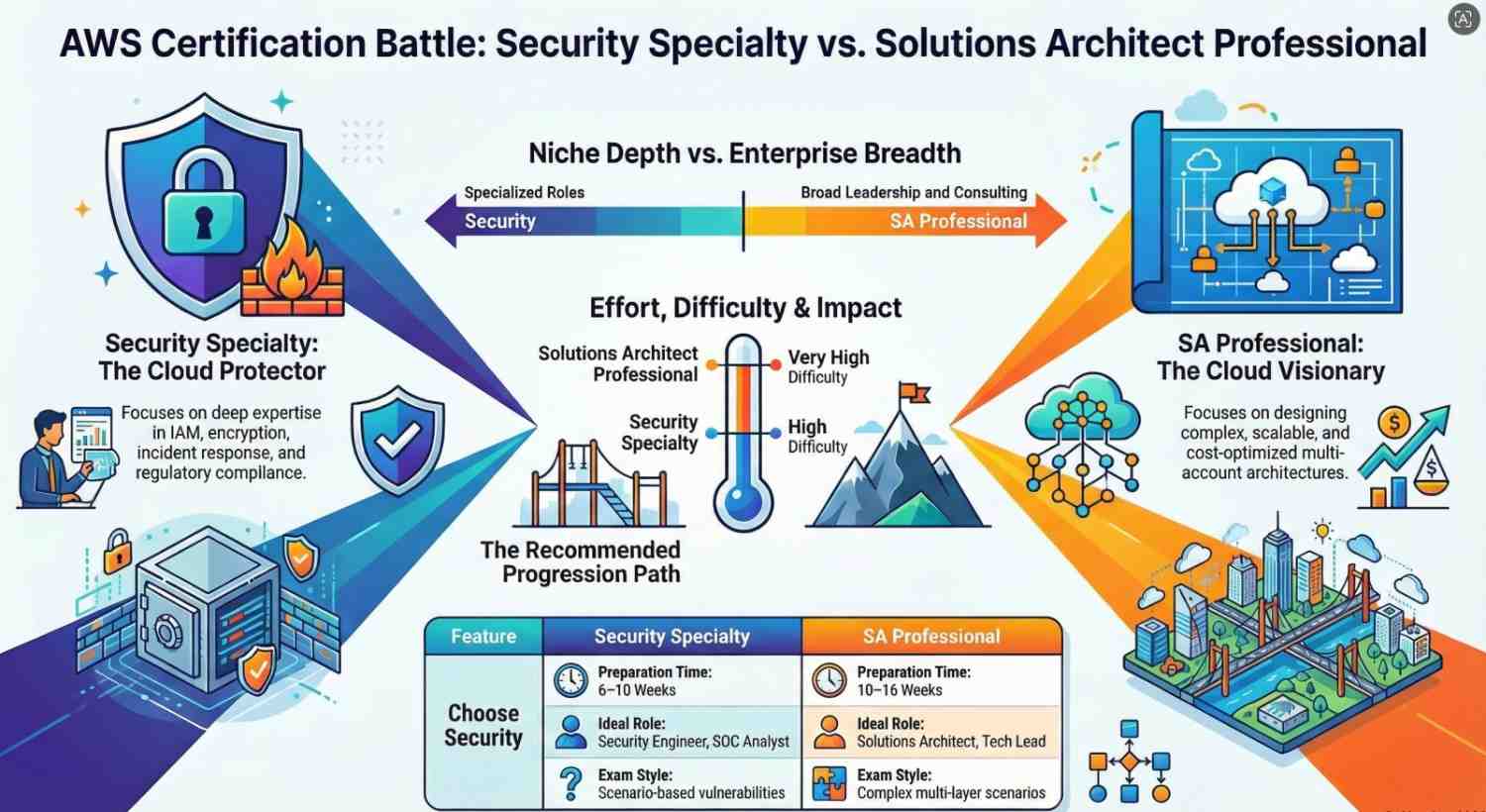 Choosing the right AWS certification can significantly impact your career trajectory, especially when you’re deciding between two advanced-level credentials: AWS Certified Security – Specialty and AWS Certified Solutions Architect – Professional. Both certifications are highly respected, challenging, and valuable but they serve very different purposes.