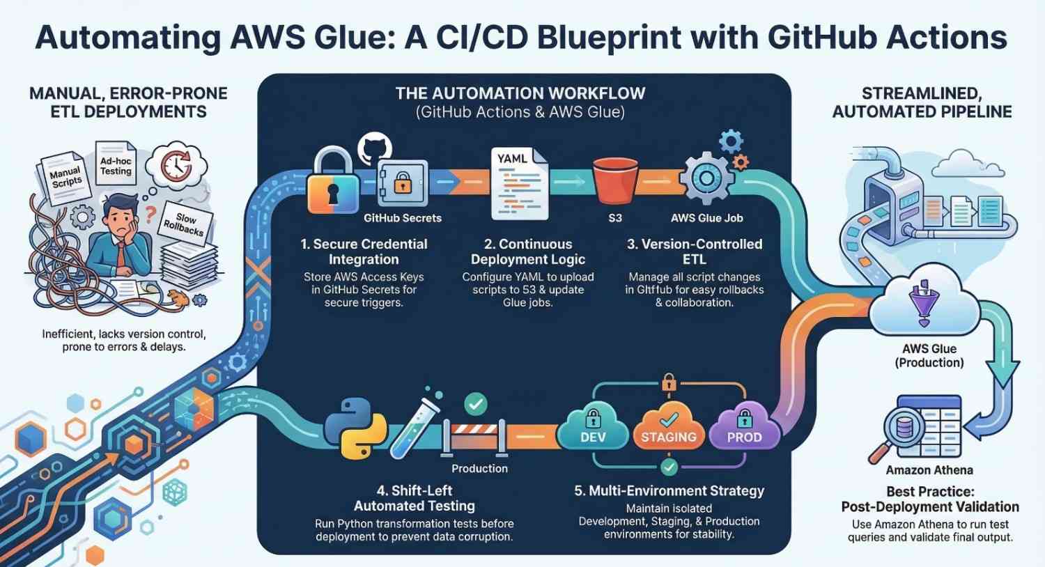 By combining the power of AWS Glue, GitHub Actions, and optionally Amazon Athena, data teams can build scalable and maintainable data pipelines.