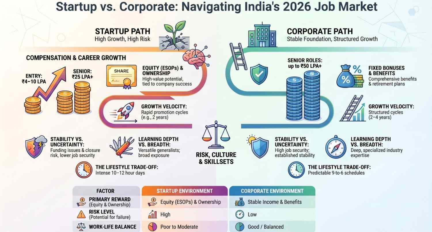 India’s job market in 2026 is more dynamic than ever. With thousands of startups emerging alongside well-established multinational companies, job seekers are often stuck at a crossroads: Should you join a startup or go for a corporate job?