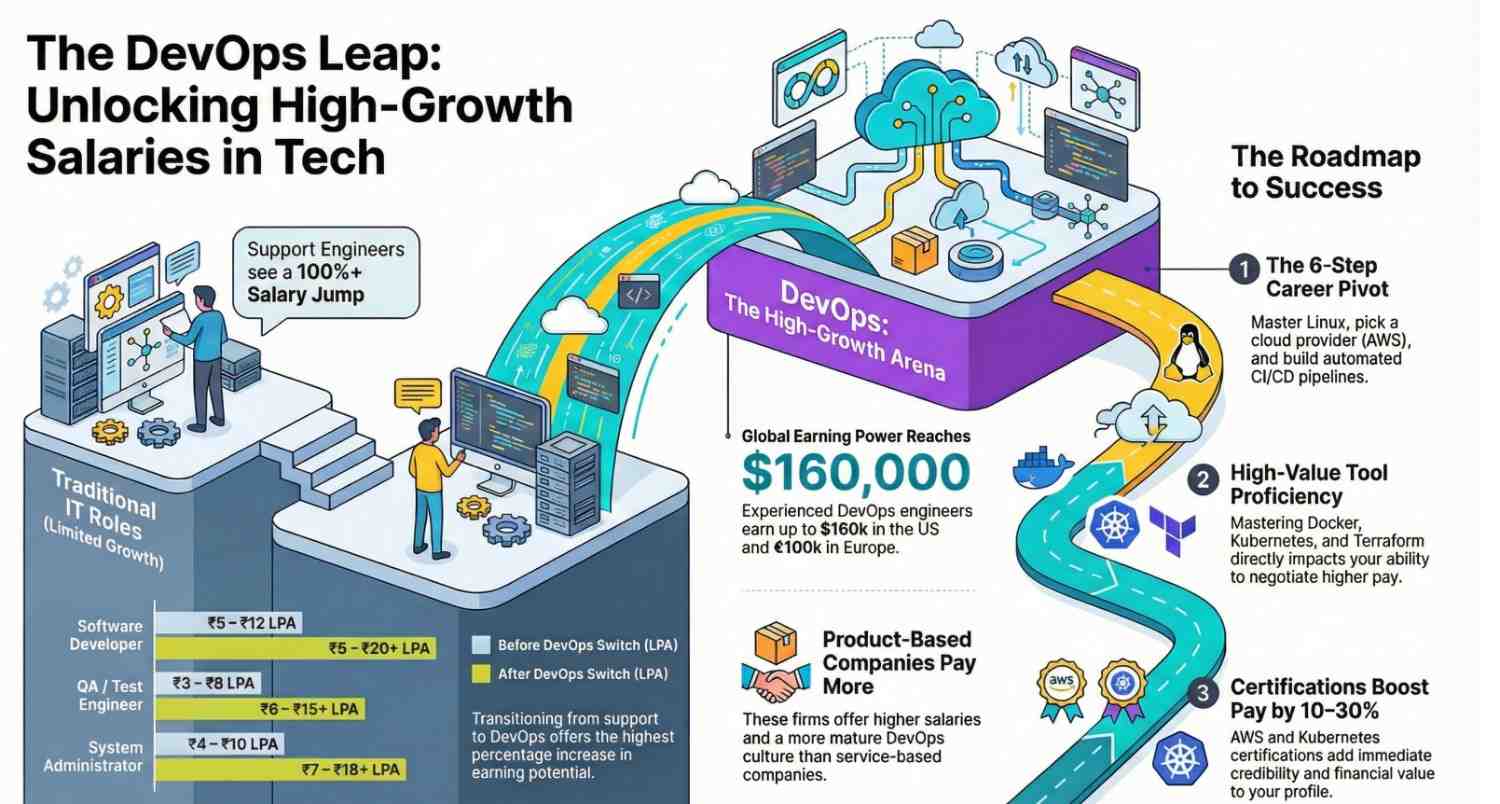 This guide breaks down how much of a salary jump you can expect, which roles transition best into DevOps, and how to make the switch strategically.