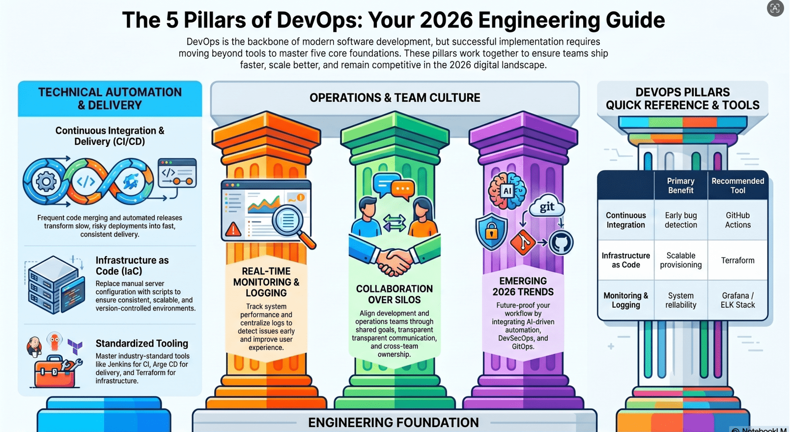 The 5 pillars of DevOps CI, CD, IaC, Monitoring, and Culture are your foundation.