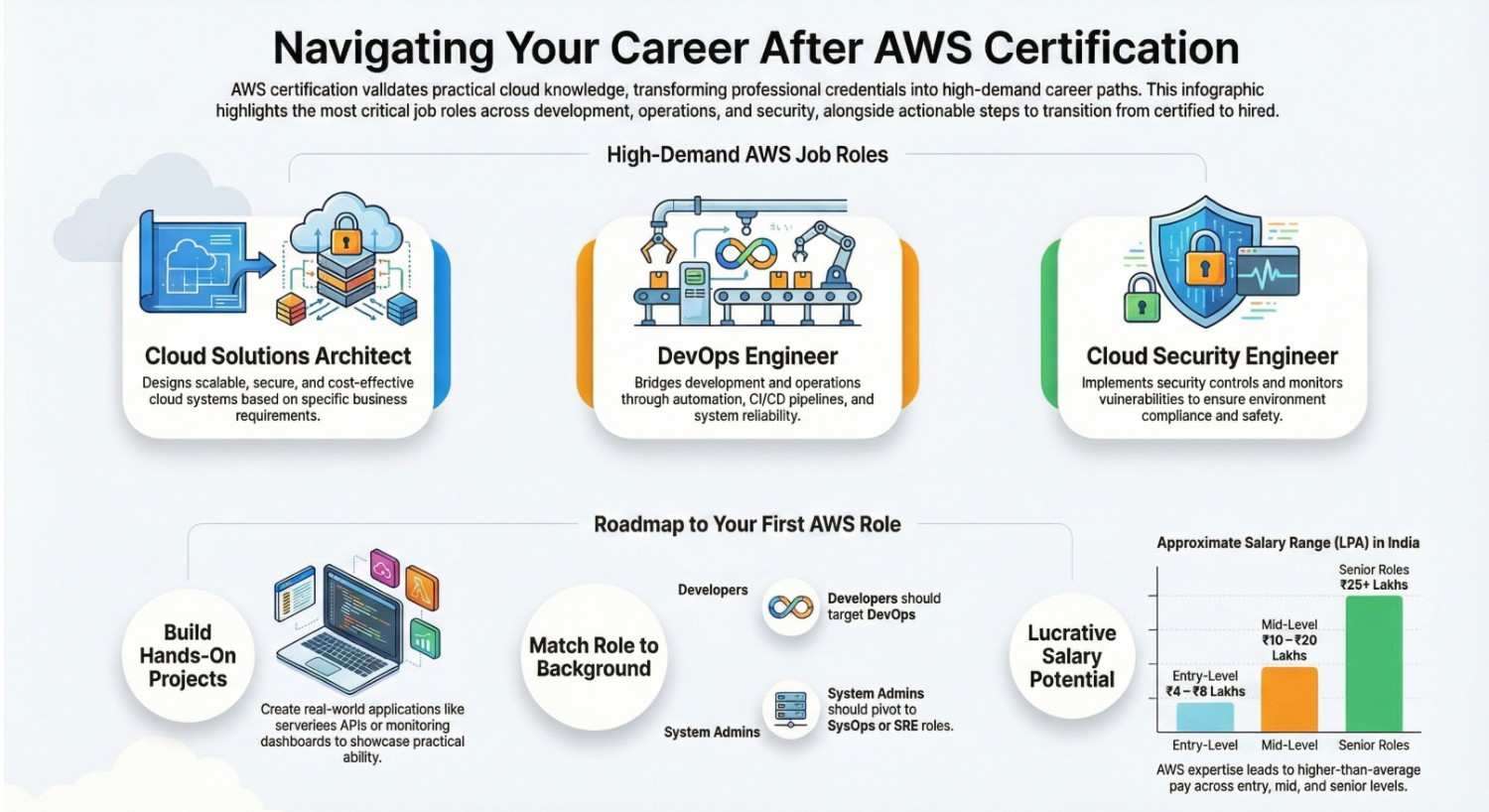 A Cloud Solutions Architect is responsible for designing scalable, secure, and cost-effective cloud systems. This is one of the most popular roles after AWS certification.