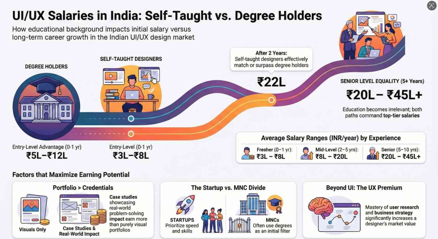 UI/UX Salary for Self-Taught Designers vs Degree Holders in India.