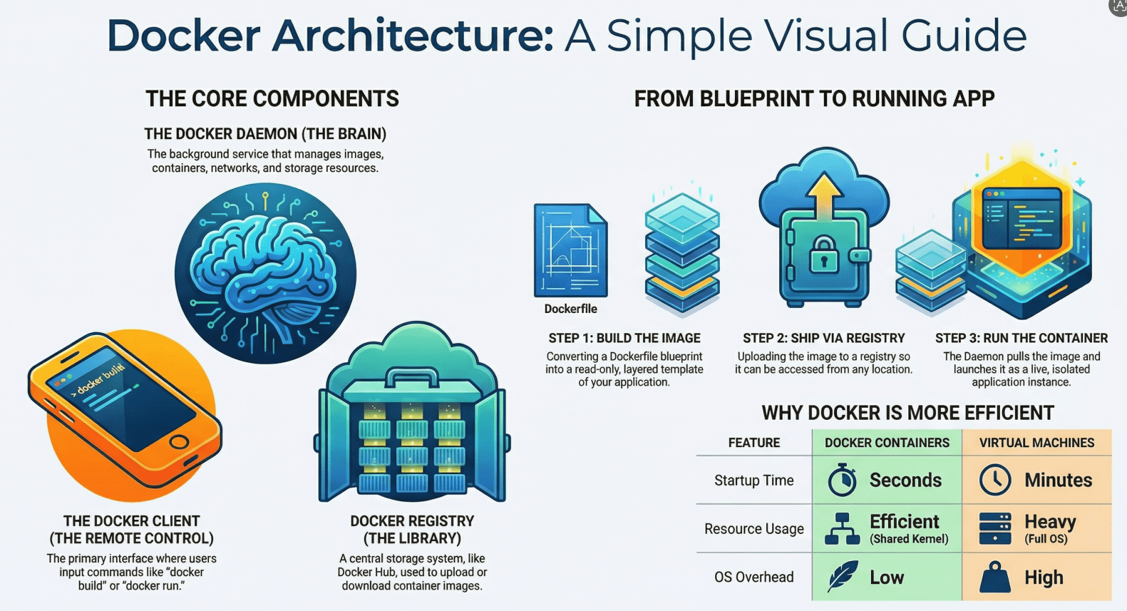 This guide breaks down Docker architecture in a simple, visual, and beginner-friendly way without overwhelming you with jargon. By the end, you’ll understand how Docker works behind the scenes and how its components interact.